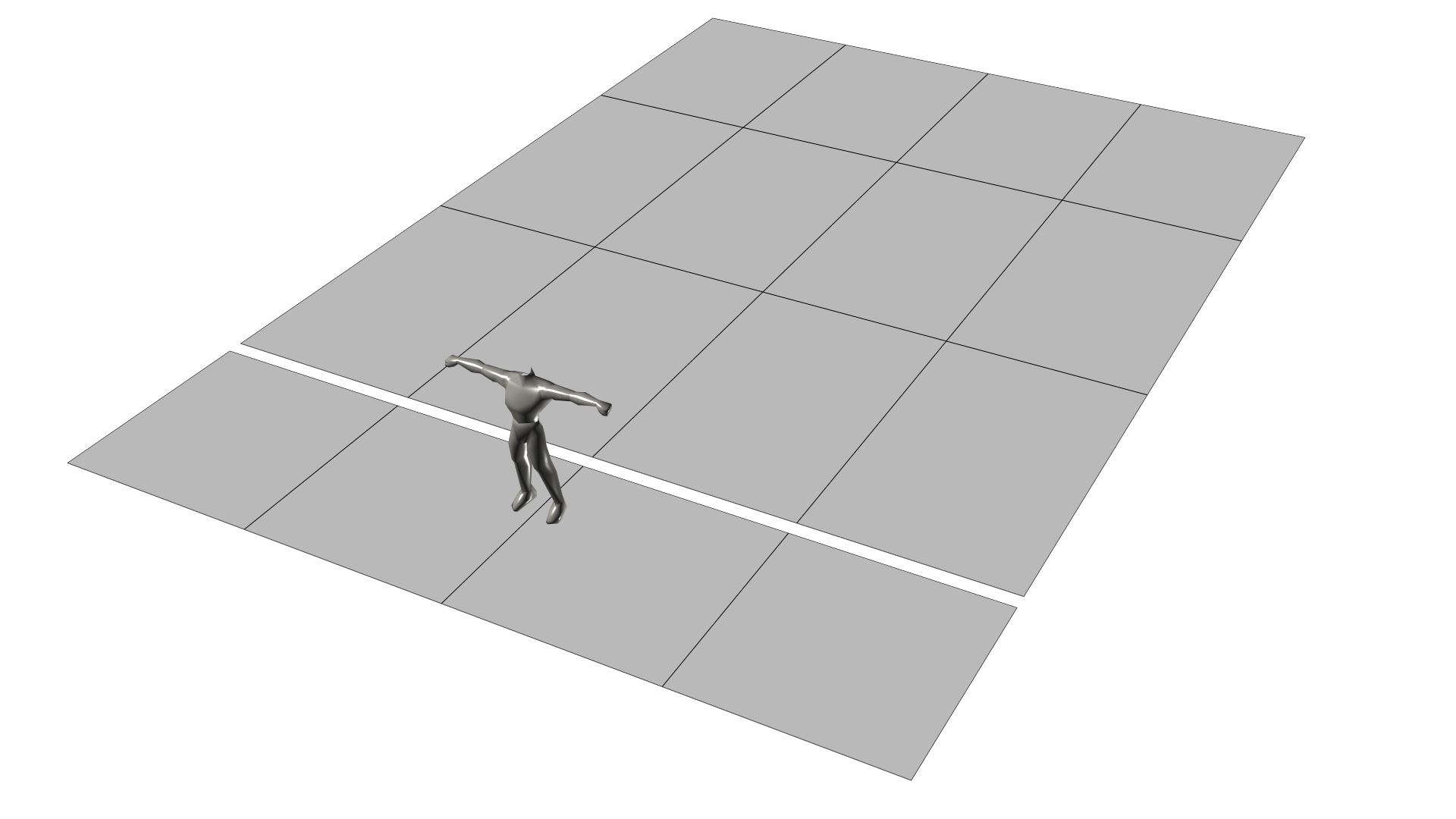 Für den Grundriss erstellt man zunächst eine ebene Fläche, um später die Maße und Positionierung im Raum besser abschätzen zu können. Die folgende Grafik verdeutlicht, wie ein Grundriss aussehen könnte. Zum Vergleich wird an der Stelle das männliche Körpermesh von Gothic verwendet.