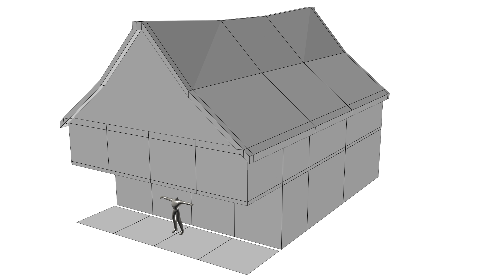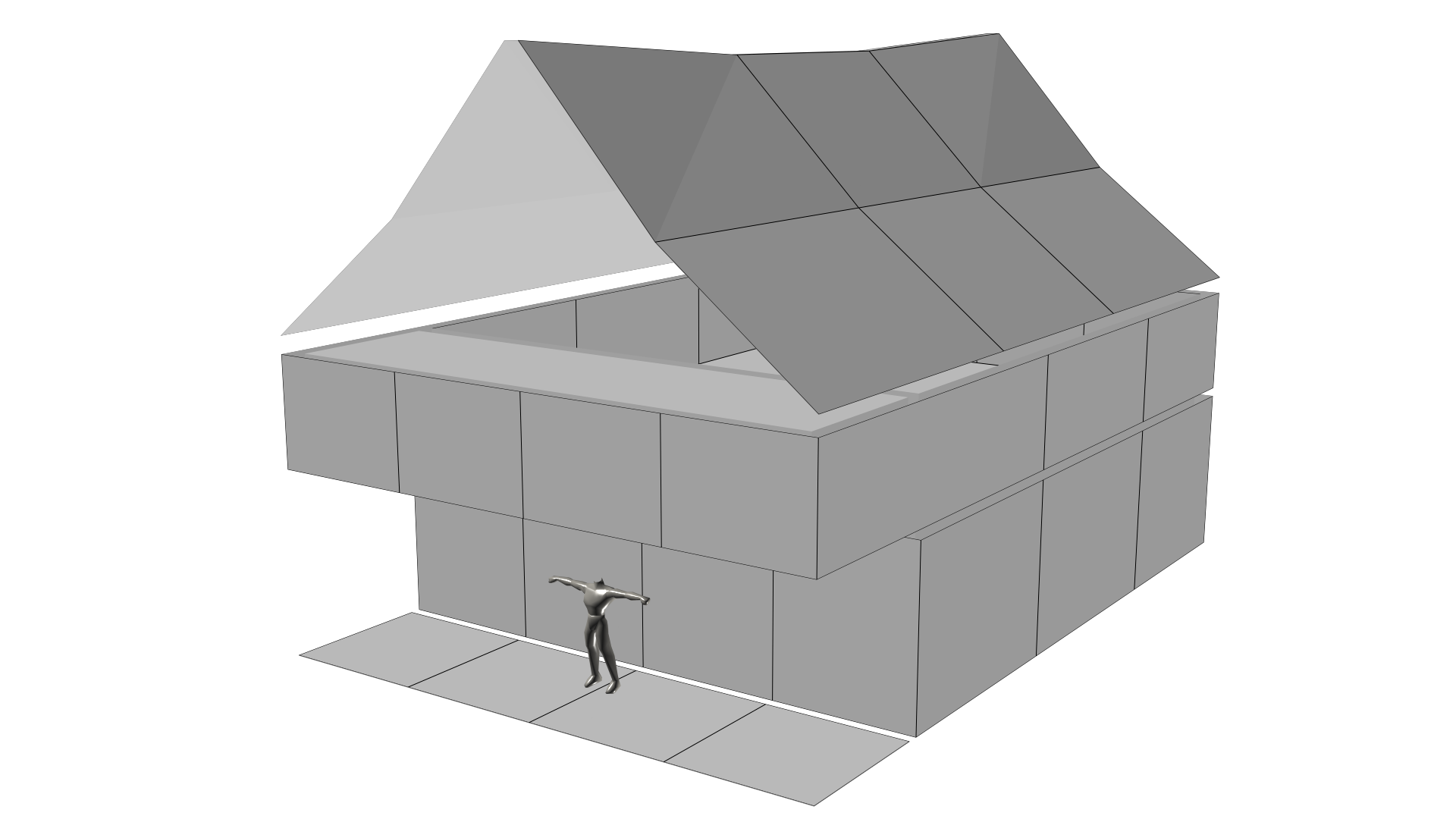 Das Gebäude soll an der Front mit einem leichten Überhang ausgestattet werden, deshalb wurde ein Teil der Untergrund-ebene vom Rest getrennt. Es verdeutlicht, dass der größere, hintere Teil den Innenraum beherbergen soll. Es werden die Kanten des hinteren Grundrisses verwendet, um die Außenwände zu produzieren. Im Modus Editable Poly werden die Kanten mittels Border-Werkzeug selektiert und mit gedrückter Shift-Taste nach oben herausgezogen, bis sie deutlich über dem Kopf der Referenzfigur liegen und eine Wand bilden, die bis jetzt noch nach innen zeigt. Um ihre Ausrichtung umzukehren, werden die Flächen der Wand mit dem Polygon-Werkzeug selektiert; mit der rechten Maustaste auf die 3d-Ansicht kann nun ein Kontextmenü geöffnet werden, in dem links-unten die Option Flip Normals ausgewählt werden muss. Die Ausrichtung der Wände ändert sich, wie auf der folgenden Grafik dargestellt.
