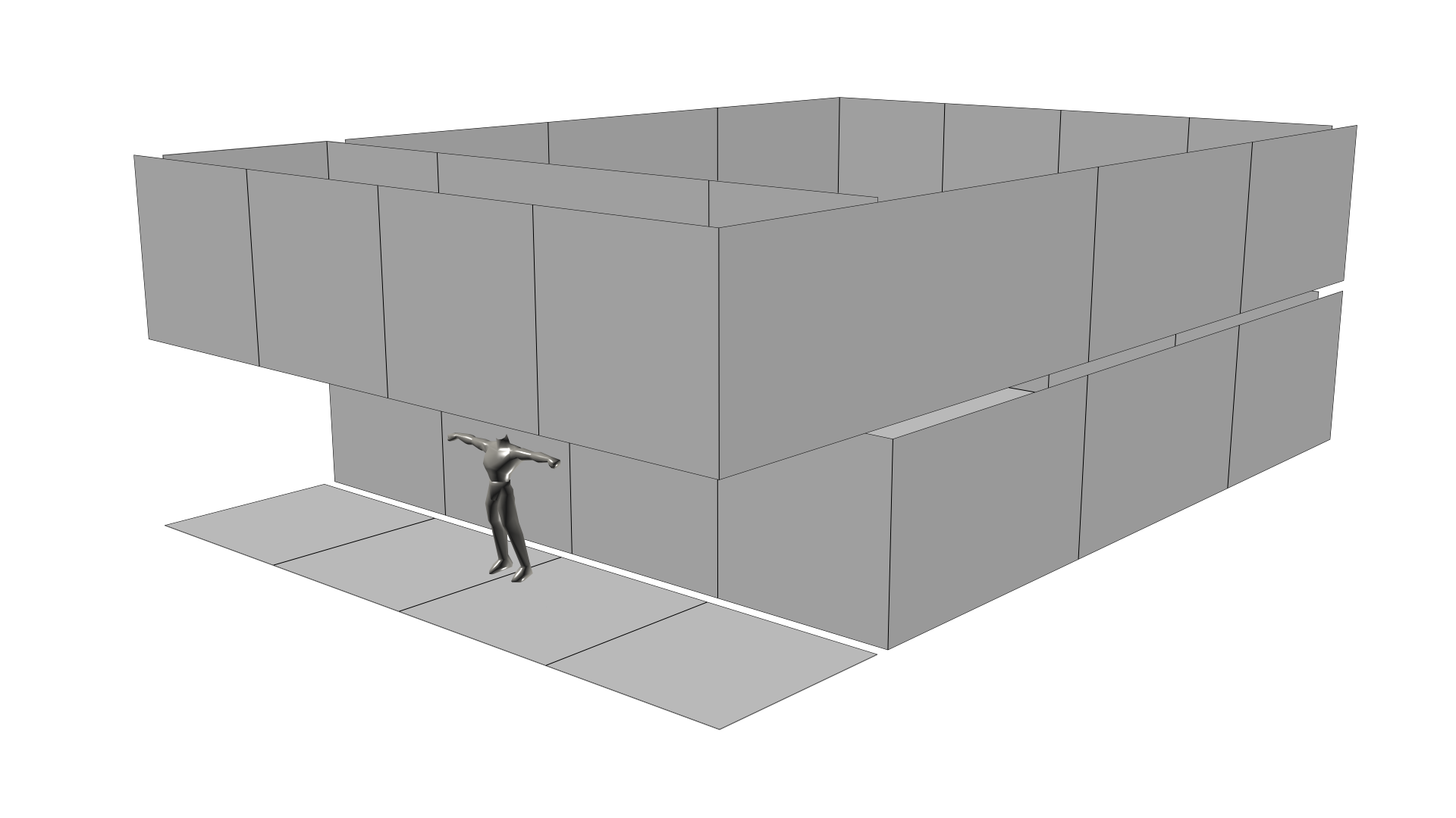 Für den Grundriss erstellt man zunächst eine ebene Fläche, um später die Maße und Positionierung im Raum besser abschätzen zu können. Die folgende Grafik verdeutlicht, wie ein Grundriss aussehen könnte. Zum Vergleich wird an der Stelle das männliche Körpermesh von Gothic verwendet.
