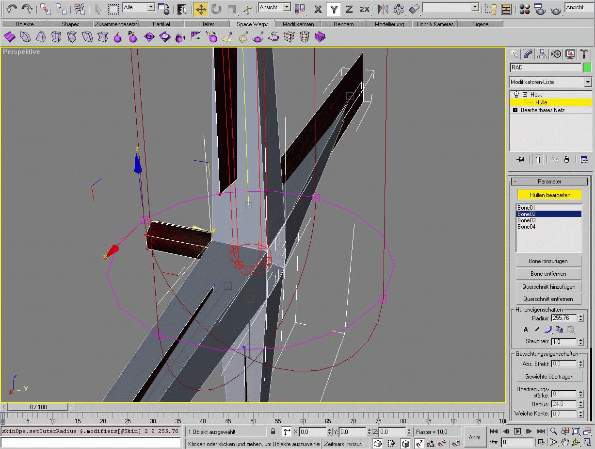 Nun können die einzelnen Bones ausgewählt werden und die Querschnitte so verändert werden (durch Verschieben in einer bestimmten Achse - aus Richtung Zentrum-Bones (hier y) werden diese skaliert), das ALLE Scheitelpunkte des Rades erwischt werden (sind dann rot markiert).