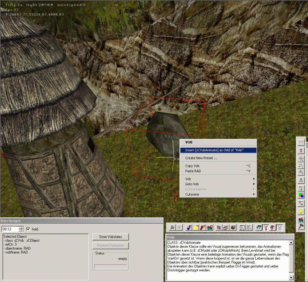 Meine Empfehlung ist daher ein zVobAnimate an ein kleines vob z.B.: ein Stein so anzuhängen das dieser nicht stört bzw. später zu sehen ist. Dieser läst sich wenigstens im Spacerfenster markieren und dient dazu das zVobAnimate damit in die richtige Position zu schieben - drehen.